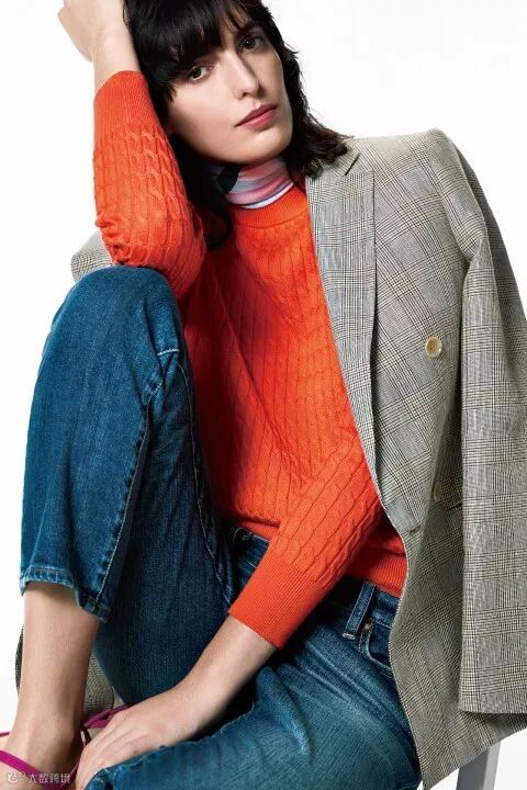 “用颜色来玩转时尚”是本季23区搭配关键。橘色的针织毛衫搭配高腰牛仔系列的休闲风格加上帅气十足的经典复古的格伦西装外套,简单中又不失经典复古韵味。
