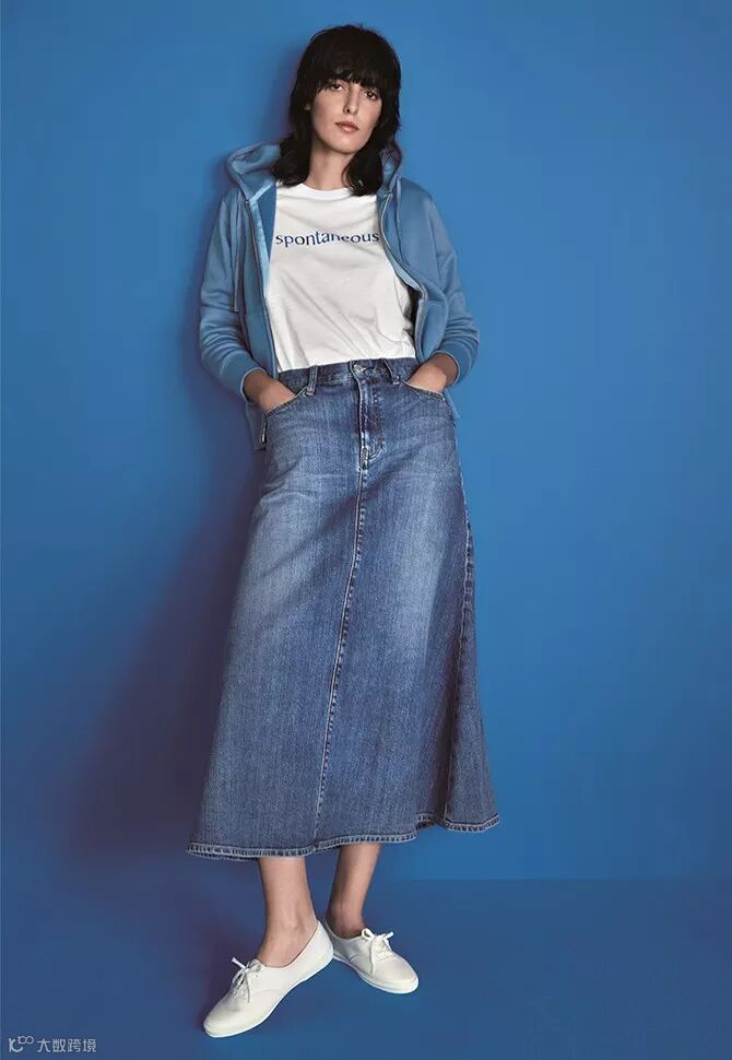 牛仔Blue是代表中性风的主要色系。既轻松休闲又不失女性韵味的牛仔伞裙上搭配面料极为柔软舒适运动风外套,整体看上去极为爽朗的春天推荐搭配。