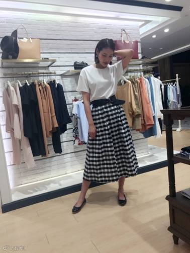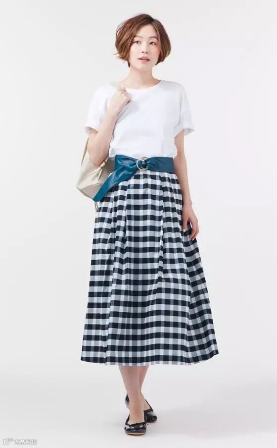 半身格纹长裙加纯色T恤上衣,清爽利落,非常有气质的搭配。