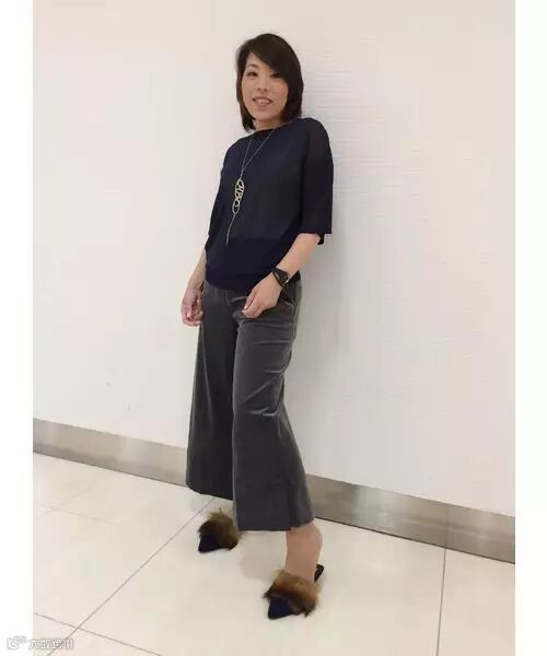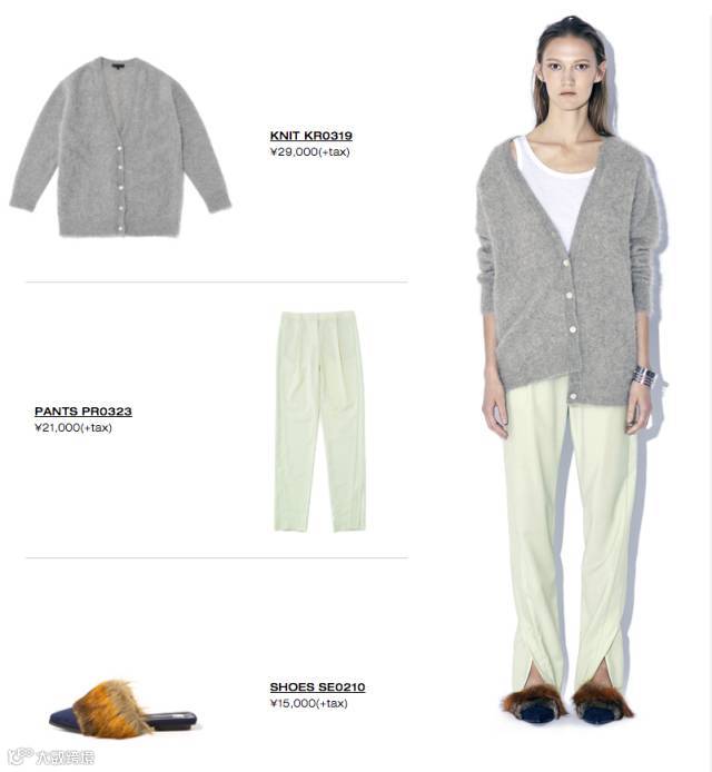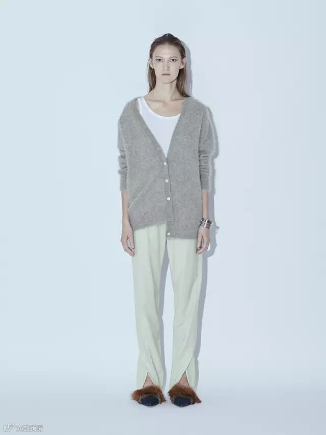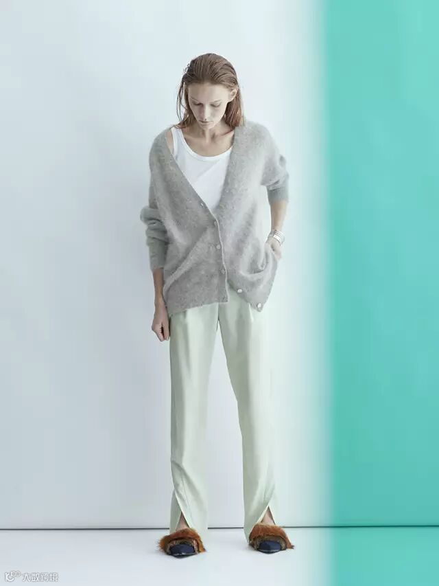 面料&设计:开衫使用毛质面料,柔软舒适,大V领设计略显慵懒风情,长裤版型略宽松,面料富有垂感,下摆开叉设计相当独特,能演绎各种风格。毛毛鞋是今年的流行款式,造型非常吸睛。