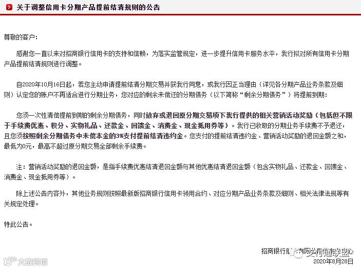 招商银行也在8月发布了《关于调整信用卡分期产品提前结清规则的公告》。从2020年10月16日开始,持卡人自愿申请提前清算分期付款交易并获得批准。根据原始分期交易,剩余的到期本金将被放弃或返还给相关的营销