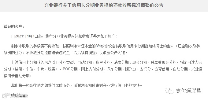 最近,兴业银行发布公告,从2021年1月1日起,将对兴业银行的信用卡分期付款业务提前还款费用进行调整,剩余未收取的手续费不再收取,按照剩余未还本金的3%或协议定价收取信用卡分期提前结清违约金。已全额收取手续费的业务,不收取分期提前结清违约金。