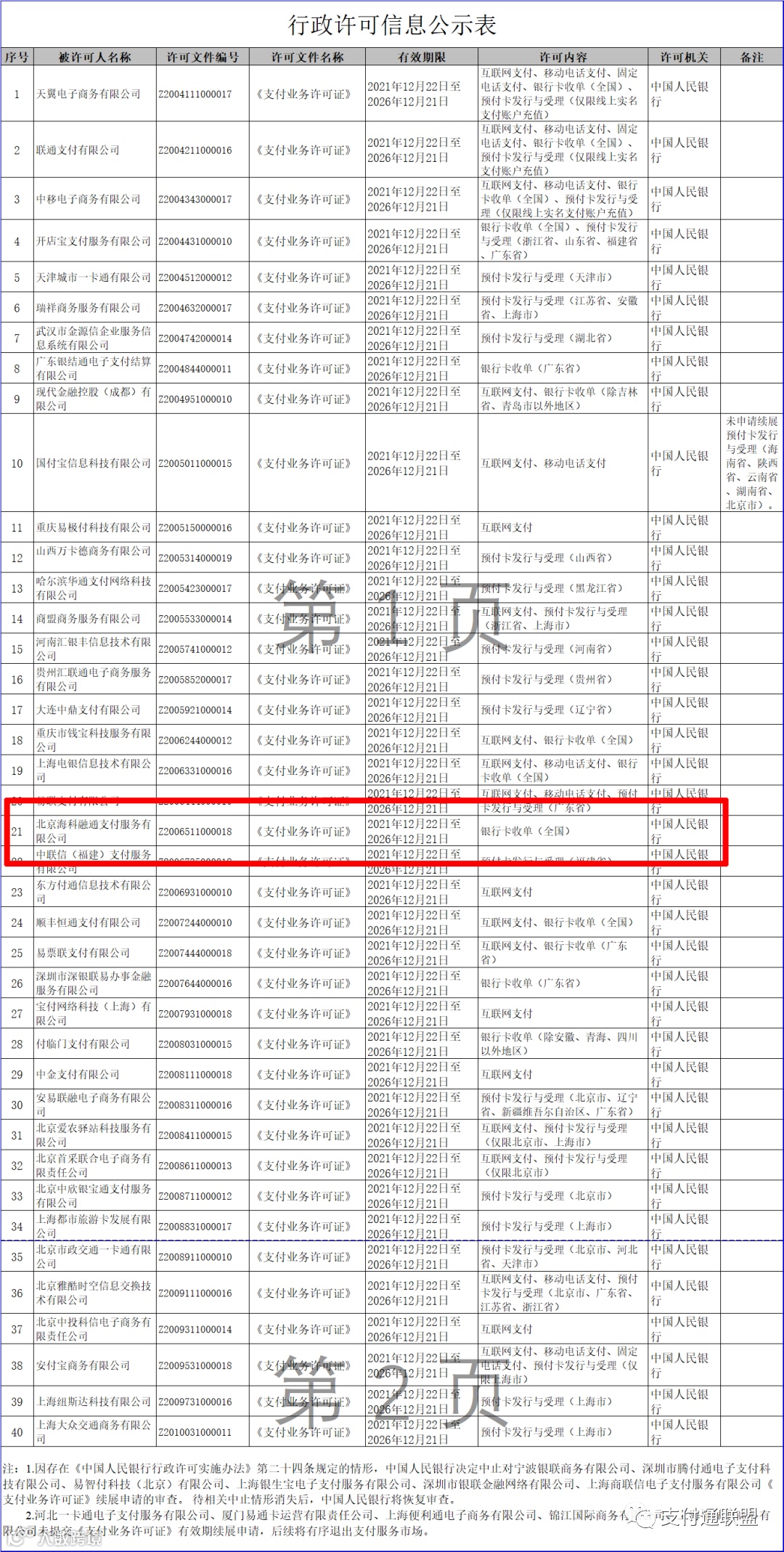 2021年12月22日,中国人民银行发布非银行支付机构《支付业务许可证》续展公示信息(2021年12月第三批),北京海科融通支付服务有限公司顺利完成《支付业务许可证》第二次续展工作。根据公告,海科融通《支付业务许可证》业务类型为银行卡收单,业务范围覆盖全国,此次续展有效期为五年,截止日期为2026年12月21日。