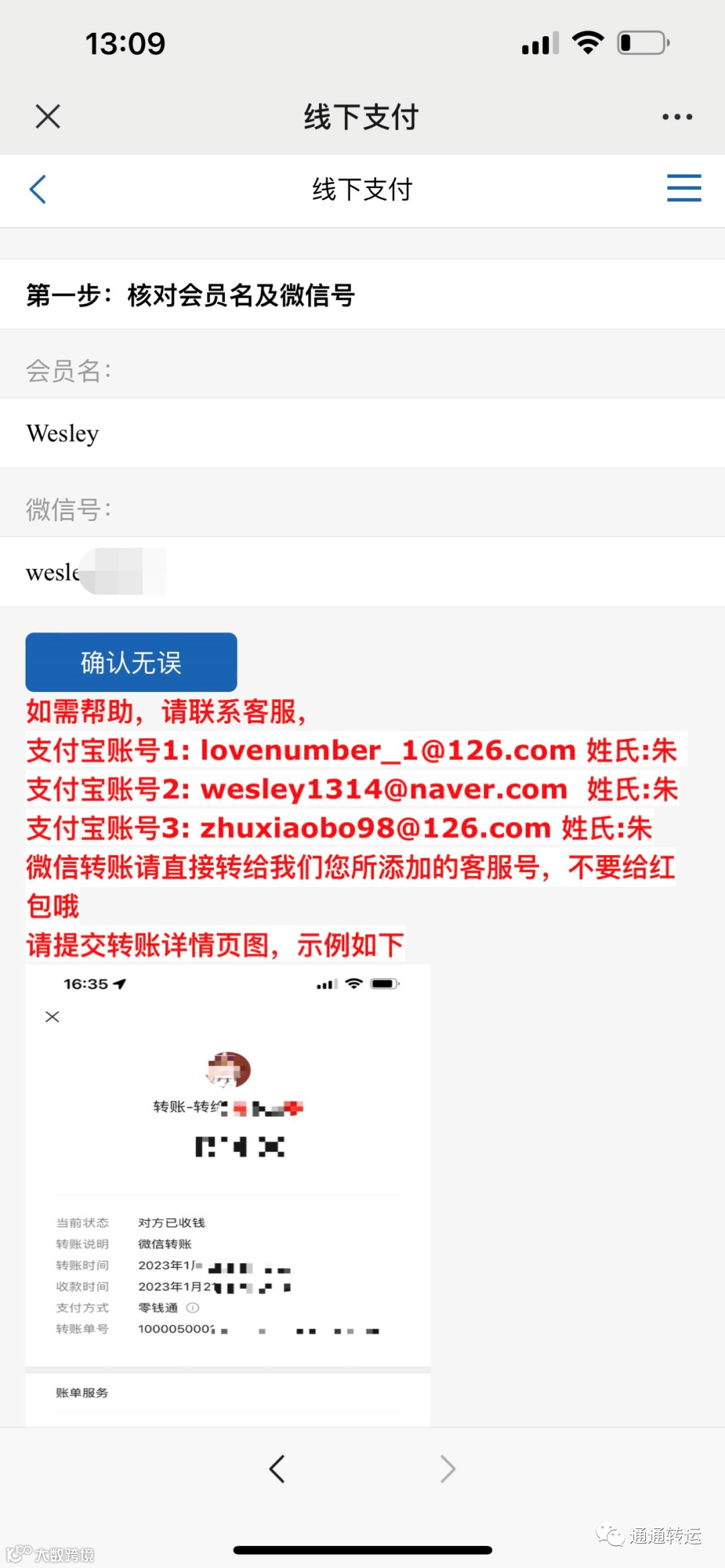 通通转运第一步:通通转运 公众号会给您发送付款通知!(最后提示很重要)