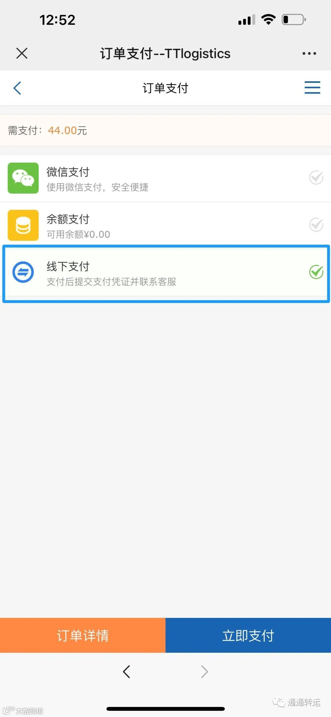 第三步:选择线下支付,进入到付款页面,线上微信支付暂不可用;推荐大家可以用第二种,联系客服提前充值,充值后续重和圆通超重有优惠,自动付款,并且出邮费后马上获取单号;