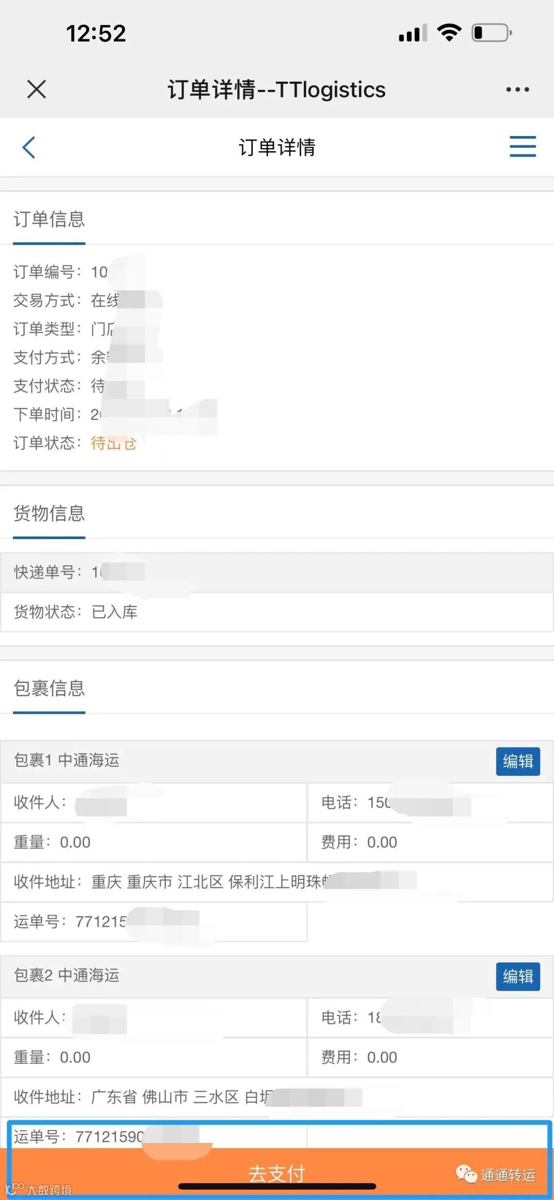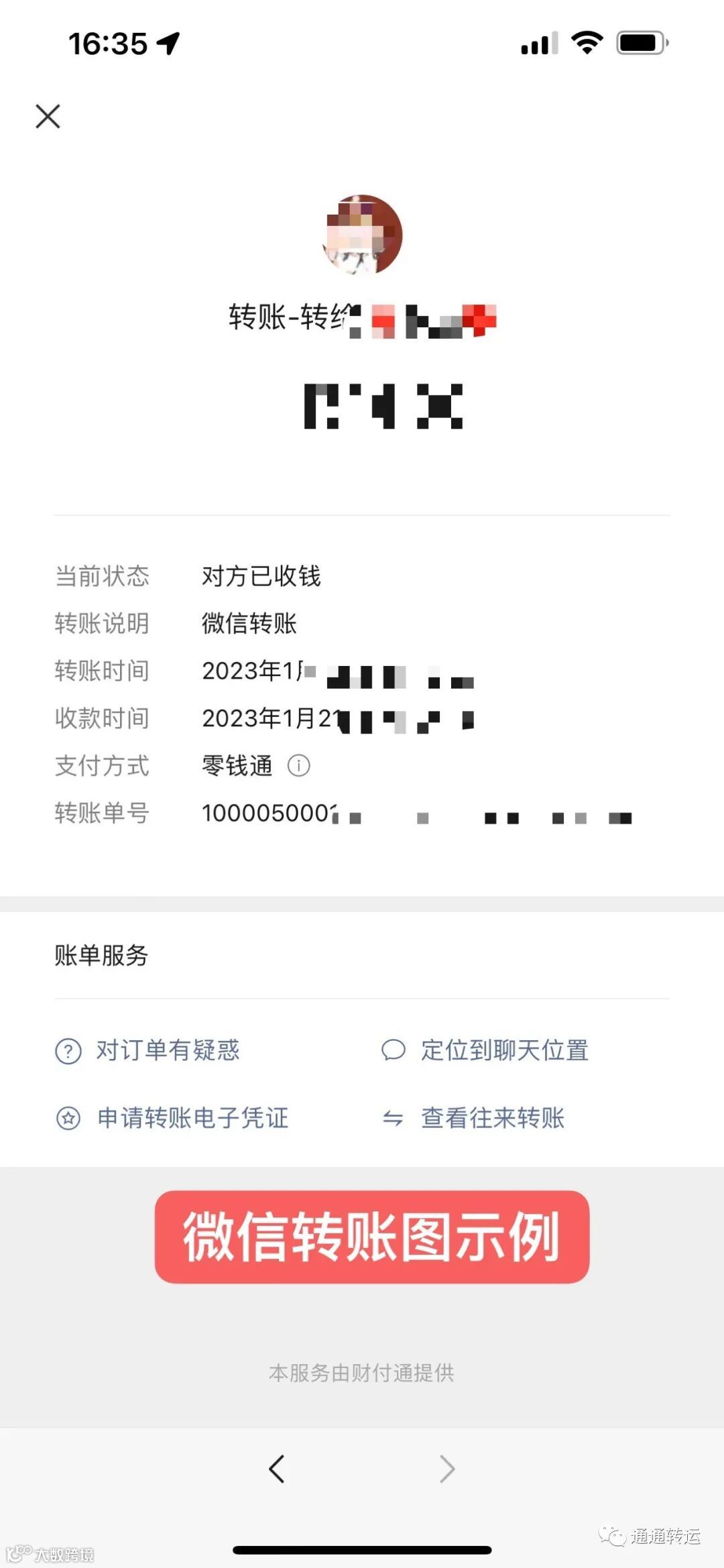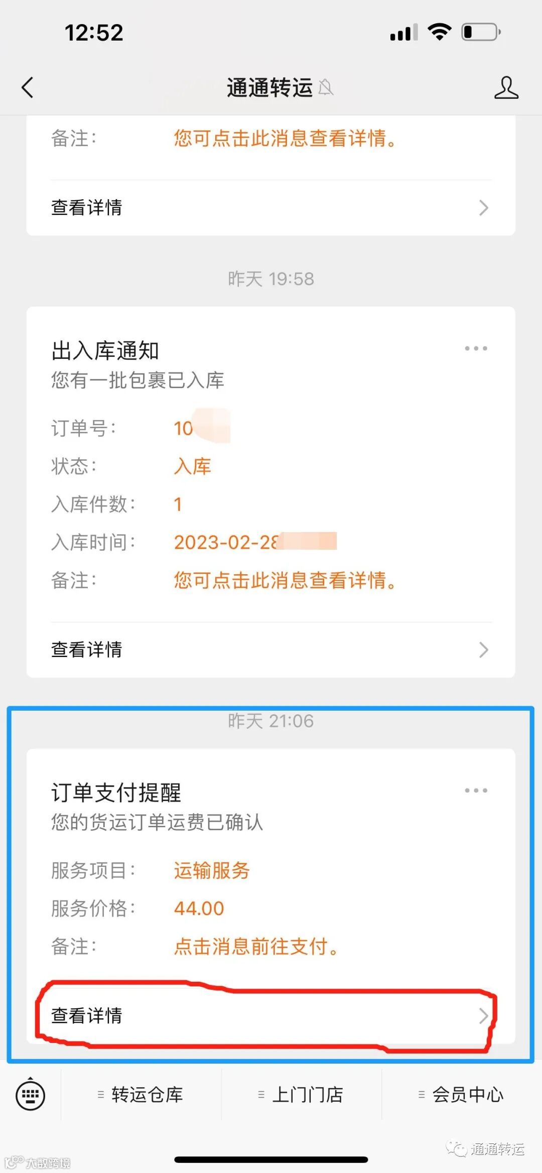 第一步:通通转运 公众号会给您发送付款通知!(最后提示很重要)
