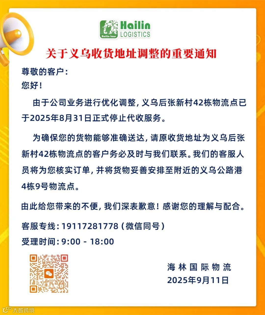 由于公司业务进行优化调整,义乌后张新村42栋物流点已于2025年8月31日正式停止代收服务。