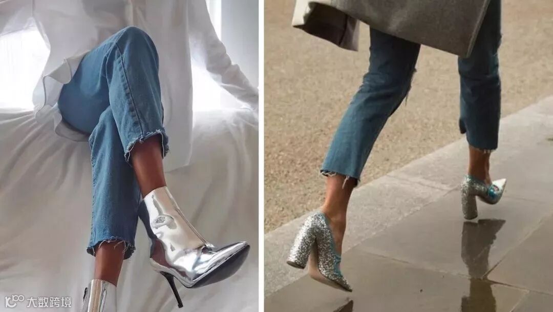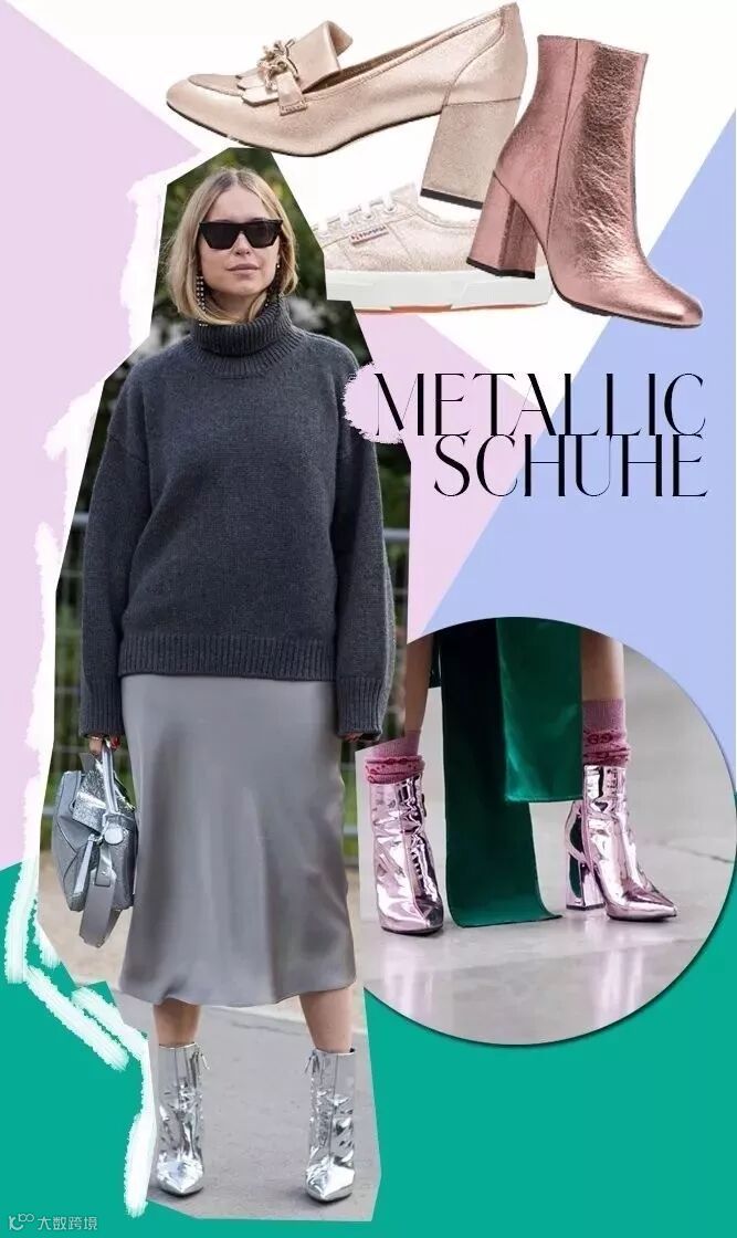 几乎每年都会出现迪斯科回声,在潮流中 - 贵族金和金属银特别流行,穿了衣服单品,鞋子也不例外,另外镜面质感的元素以及链条和水晶的金属配件的鞋子也特别流行。