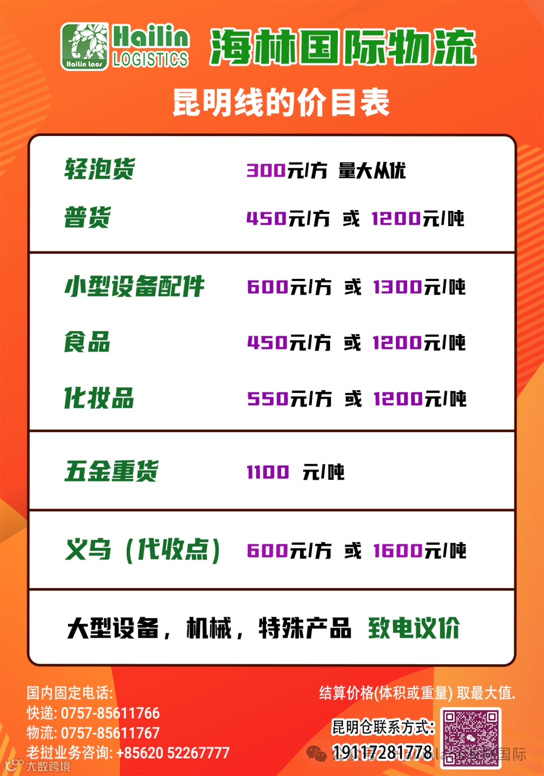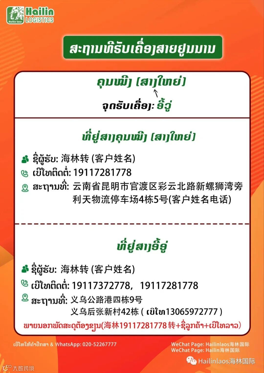地址:云南省昆明市官渡区彩云北路新螺狮湾旁利天物流停车场,4栋4-5号(客户姓名+老挝电话号码)
