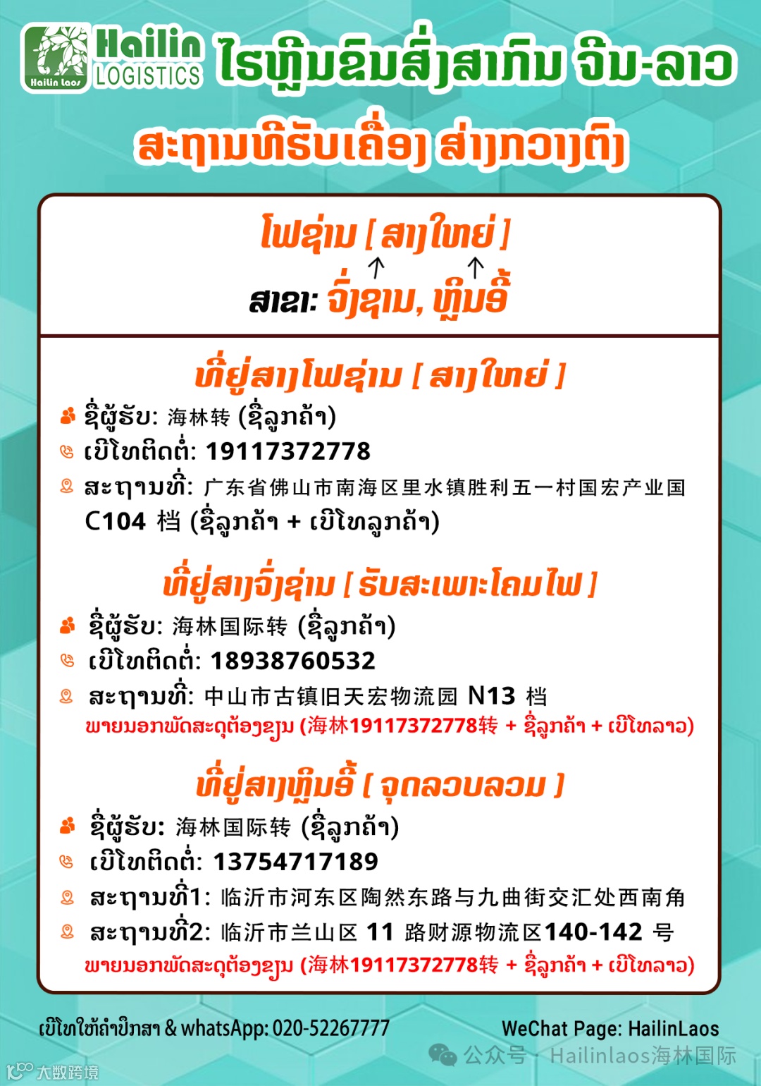 地址:云南省昆明市官渡区彩云北路新螺狮湾旁利天物流停车场,4栋4-5号(客户姓名+老挝电话号码)