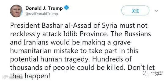 要知道,几天前,为警告俄罗斯、伊朗和叙利亚别动武,特朗普在推特上发出了最严厉的警告: