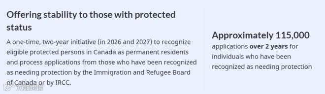 移民水平计划显示,政府会一次性让约115,000名已经在加拿大的受保护人士(protected persons)转为PR,这一措施可能会纳入该新通道。