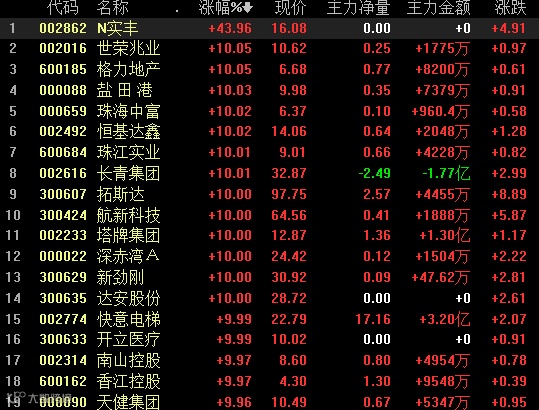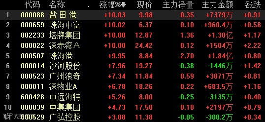 此外,午后粤港澳概念股集体拉升。世荣兆业、盐田港、珠海中富、塔牌集团、深赤湾A、珠海港等涨停。