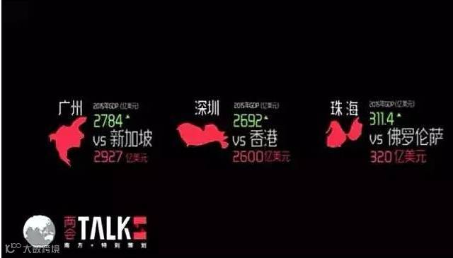 来一组直观的对比,2015年珠三角9个城市的GDP对比中,广州已经赶超新加坡;深圳已经赶超香港,珠海与意大利的佛罗伦萨相当……"大湾区"一旦建立起来,会成为世界最大的城市带。