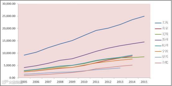 图1:上海作为“核心城市”与周边七个城市近十年生产总值比较(单位:亿元)
