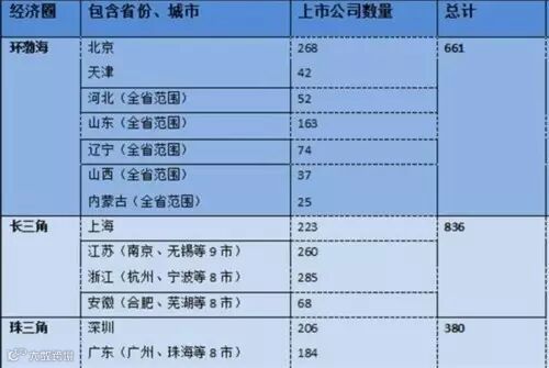 我们知道,上市公司必须规范管理,无论是财税还是经营都须正规化,上市公司资信评级较高,不仅可以促进就业,还可以为当地吸引广泛资源,带动城市发展,进而带动诸多行业发展,形成合理。城市的发展最划算的办法是拥有较多数量的上市公司,上世纪90年代沪深交易所的建立,以两大交易所为核心的长三角、珠三角经济获得了极大养分。下面我们来看下上市公司在三大经济圈目前的分布。