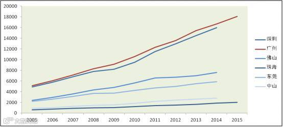 图3:广州、深圳作为“核心城市”与周边四城十年生产总值比较(单位:亿元)