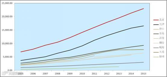 图2:北京作为“核心城市”与周边七个城市近十年生产总值比较(单位:亿元)