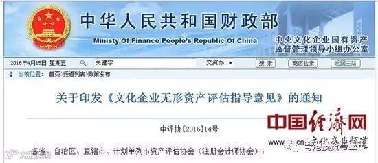 中国经济网北京4月15日讯 中央文化企业国有资产监督管理领导小组办公室网站14日消息,近期,在中共中央宣传部和财政部的组织和指导下,中国资产评估协会制定并发布了《文化企业无形资产评估指导意见》(以下简称《指导意见》)。据中国经济网记者了解,该《指导意见》自2016年7月1日起施行。