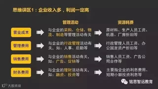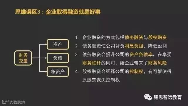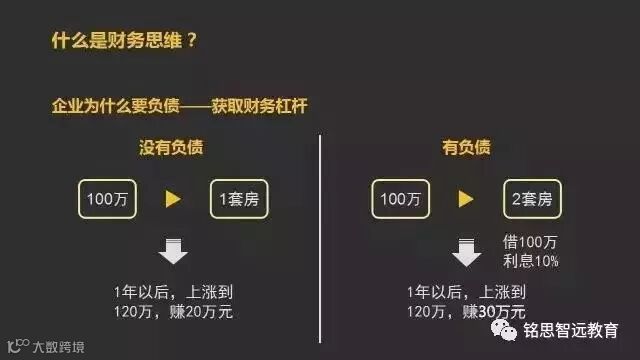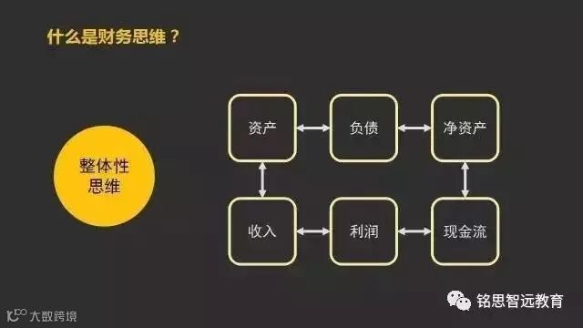 假设我们公司未来的目标是要大幅度提高公司的收入,于是公司就去为这个东西做准备,要去购置相应的资产。资产多了就会引起债务的增加。债务增加,就会有费用,可能会有一些借款费用,就会影响到利润。最后可能会使得公司资产负债率上升,同时由于债务成本特别高,公司的利润不一定会同比的上升,所以我们任何一个业务,都会影响到多个财务变量。一定要用整体性的思考方式,要用联系性的思维方式,来解决公司的业务和财务的问题,千万不可孤立的去看待任何一个变量。