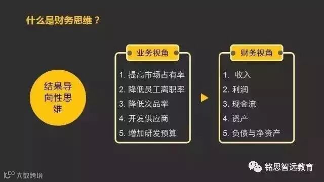 请看这张图,在这个框的左边,是业务人员的视角。业务视角讲究的是过程,但是我们财务视角讲究的是结果,因此无论有哪些业务的变量,最后都希望体现在一定的财务变量上。财务变量请看右边这个框,就是收入的上升,利润的增加,现金流变得充裕。资产质量得以提高,负债得以控制。