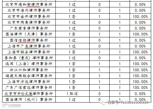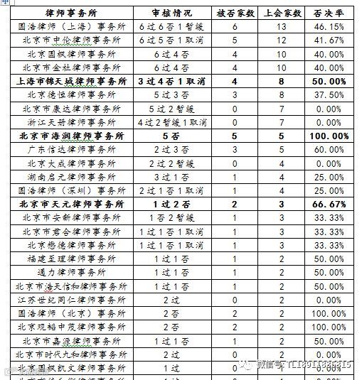 律师事务所:表现最好的是北京市康达律师事务所和浙江天册律师事务所,否决率0%。表现最差的是北京市海润律师事务所5否,上海市锦天城律师事务所3过4否1取消,广东信达律师事务所2过3否。