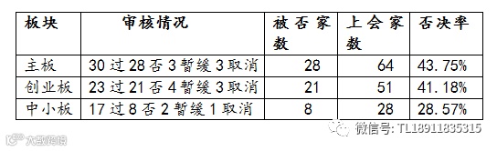 新一届(第十七届)发审委的截止到2018年2月3日审核结果:总计审核143家、否决了57家、暂缓表决9家、取消审核7家、过会69家。否决率达39.86%,通过率达48.25%.在拟上市板块方面,拟上交所主板上市的IPO有22家(22家被否,上交所主板被否率51.16%)、中小板有5家、创业板15家。