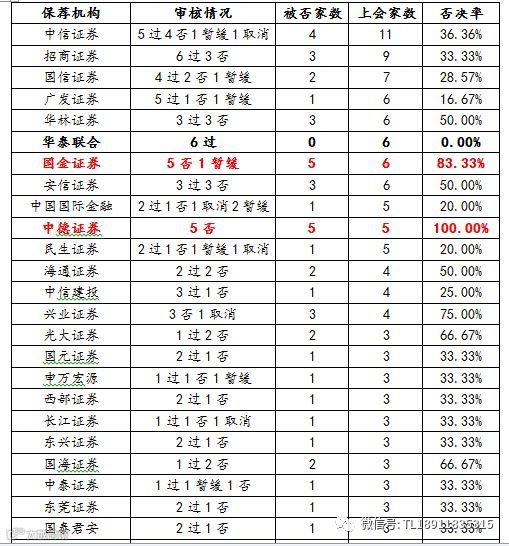 保荐机构:表现最好的是华泰联合6家上会6家过会,通过率100%。表现最差的是国金证券5否1暂缓否决率83.33%,中德证券否决数量5家,5家上会否决5家,否决率100%。