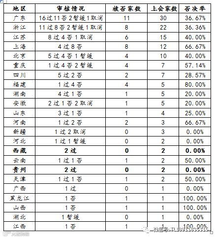 地区:表现最好的西藏和贵州,上会2家通过2家。表现最差的是上海,12家上会8否,否决率66.67%。还有福建,5家上会4否,否决率80%。