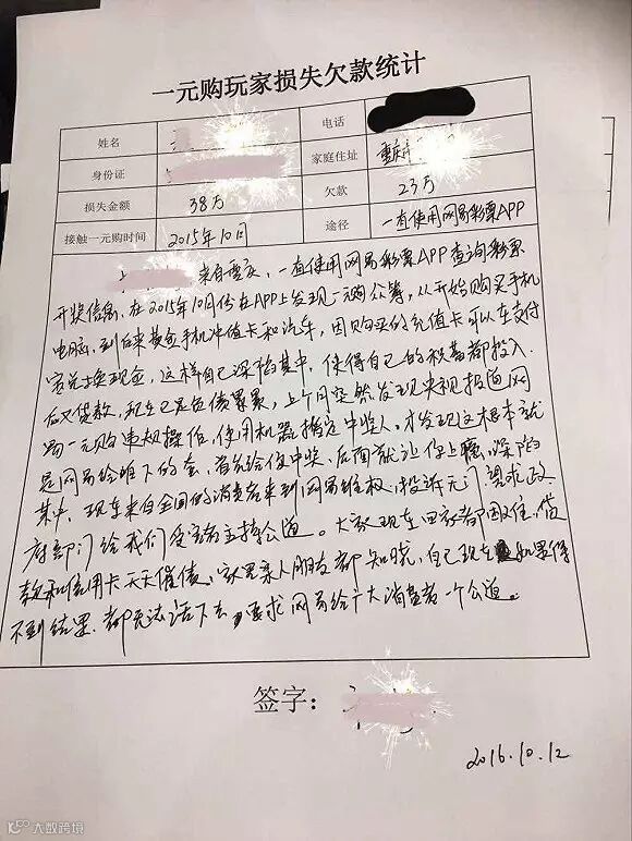 一名“一元购”的参与者表示:以前玩过网易游戏,通过网易公司发来的一些短信,点入“1元夺宝”界面。开始从一块两块投,然后三十五十,然后成百上千,最后就上万。大概从去年12月份开始玩,到如今,大概亏了四十几万。