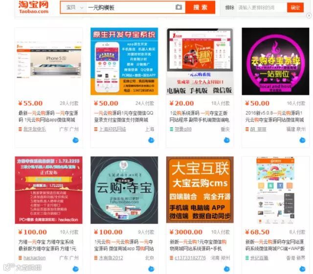然而你很难想象,对于这些数量庞大、功能相似的“一元购”平台,整个程序在淘宝上只卖几十块钱,就是说,只要你花几十块钱买个整站模板,再弄个域名和虚拟空间,很容易就能架一个一元夺宝的网站。