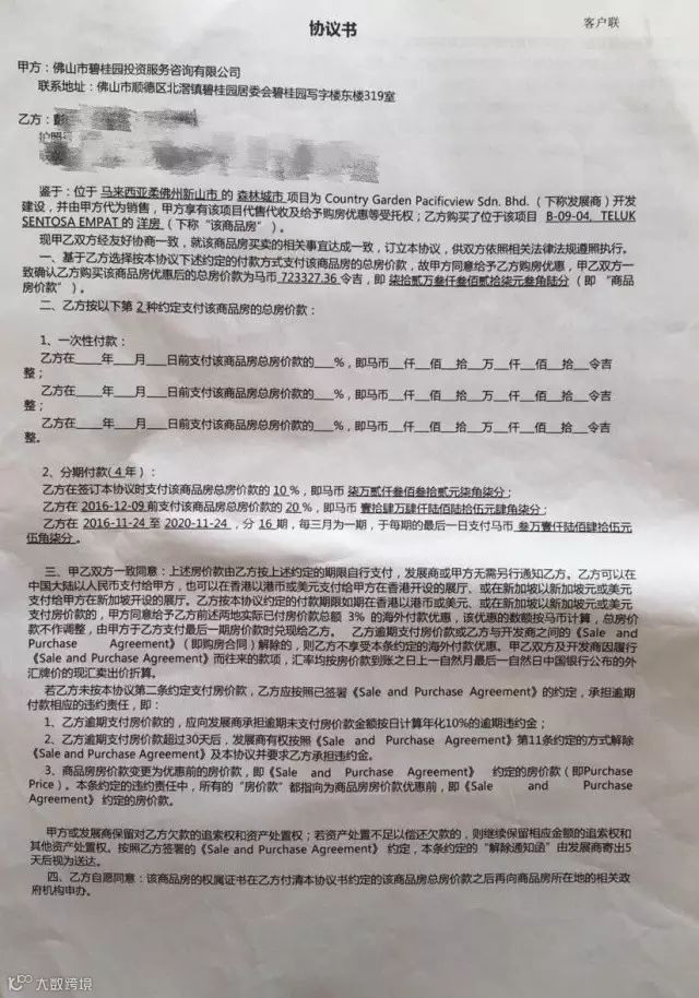 来自长沙的彭先生,去年3月跟着看房团去了新山,交付10%的首付后签了买房合同和一堆协议。其中一份协议是空白的,最重要的是,这堆协议里夹着一张英文的协议,当时并没有人注意到。回国后找人翻译发现协议内容如下,第一条:购房者自愿放弃找律师的机会来审查合同,就用森林城市安排的。第二条:周围配套和墙边以及阳台绿化购房者无条件同意分担费用。第三条:购房者同意碧桂园无条件用所购买的房子抵押给银行,就算是全款支付的也不需要授权。第四条,碧桂园保留可以不卖房给购房者的权利,钱分期退还而不用负任何责任。