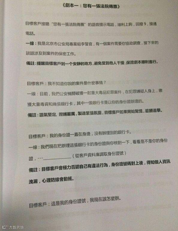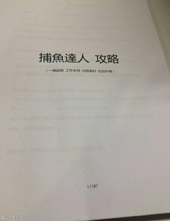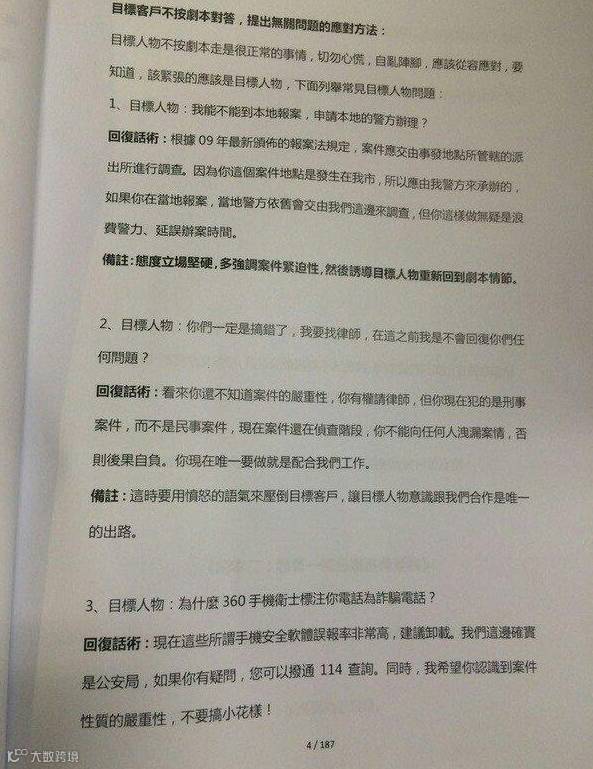 《捕鱼达人》共计187页,包含常见的“法院传票”、“包裹未签收”等骗术。场景设计、剧情渐进、谈话方式、语气停顿,都有明确标注。