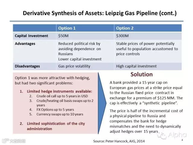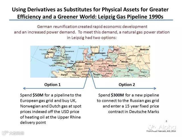 20年前,东德、西德统一了,所以东西德的统一首先要解决的第一个问题就是经济的不统一。我们来看一下西德的一个大城市莱比锡,莱比锡需要发展,这个时候它需要大量的能源。莱比锡要获得这样的一个能源和资源,唯一能做的就是利用天然气。莱比锡这个城市以前是没有任何的金融市场,也没有定价市场,也没有自由经济市场,莱比锡这个城市的管理,对于这个城市天然能源的交易是非常的不了解。当时俄罗斯说我给莱比锡提供15年的一个固定的天然气的价格,15年用一个合同定价,但是莱比锡需要在东部一直要修到俄罗斯的管道。要修这样一个天然气管道,当时的定价是3亿美元,所以当时听下来这个价格还是非常高的。还有另外一个选择,就是从俄罗斯的西部从北海地区来引进这个天然气。这个选项只需要修大概很短的一段,也就是1.5亿美元就可以了。但是大家知道西部天然气的价格是浮动的,石油、天然气在西部地区这个价格都一直在不断的波动,所以这个时候莱比锡面对着两种选择,我要不要拿俄罗斯这边锁定价格的长期合同,或者从欧洲西欧北海地区引进天然气,但是价格是浮动的。有一家大银行他突然间想到一点,他说要不我们两个都结合起来怎么样?我觉得这个就是会给莱比锡一个很好的选择。