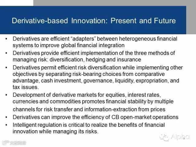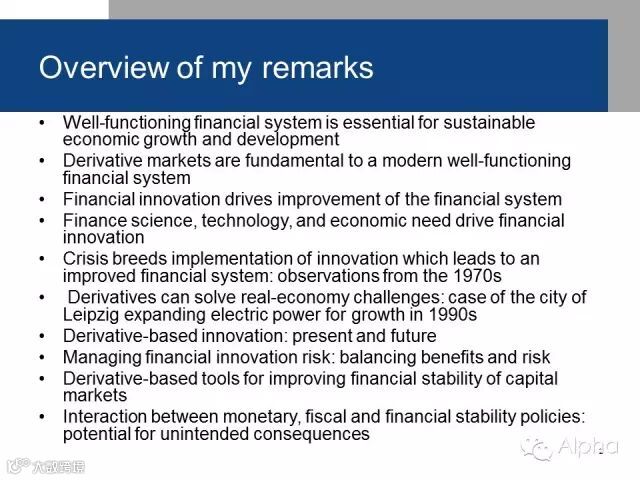 我非常荣幸今天早上能和各位齐聚一堂,也非常荣幸能够被邀请到这里。今天我讲的,就是探讨一下金融创新、衍生品市场在经济发展中的作用。