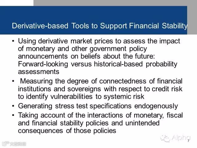 衍生品能够做其他的事情,我们大家都知道,它能够提供非常多的风险转移的渠道,实际上在87年这样一个危机的时候,在美国当时我们的股票市场还有货币市场,这一些市场的专家就直接回家了,他们直接就关门了。因为他们根本就无法接受这样的一个市场现状。但是,我们的期货市场还是继续在贸易,这也是可能的。因为人们还在去看,看看期货的价格和现货的价格,还有之间价格的差别,但是有的专家就是失望了,就直接回家了。问题在于我们有很多的这种渠道来转移风险,如果一个渠道出了问题,没关系,我们还有其他的一些渠道可以继续稳定住市场,它是非常的复杂。但是大家都应该同意第一点,就是说我们不能够让我们的监管者过的太简单,我们应该去把市场和系统做的非常的完善,甚至是有些复杂,但是我们不能够为了让监管者这么简单就把系统做的时间的简单。我们的系统并不在于说某一些职位上的人他做的好工作,还是他们承受不了这个工作,就决定我们怎样去定义市场。实际上我也有很多中国的学生,但是不管怎么样,我们的系统目的是要维持这个市场的稳定,而不是说要让我们的领导过得好一些。我们一定要去让正确的人在这个位置上处理好所有的这些问题,而且它也能够去改善中央银行的这种效率,我们可以用衍生物来把在场外的一些业务做的更加顺畅,当然这个可能还需要更多的时间讲,所以我就不讲了。