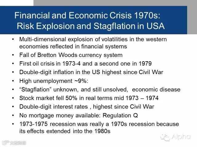 70年代美国金融界受到了多少次冲击?基本任何一个方向上,波动、变革方面,都有很多的爆炸性的变化。而且二战之后有布雷顿森林体系的货币系统,汇率是固定的,然后体系瓦解了,这是第一次冲击。还产生了第一次石油危机。原油价格从250跌到30美金,这是非常大的一个冲击。当时我们根本不知道会有这样的情况,我们不知道会有这么多危机。然后美国通胀达到了两位数,自19世纪内战以来美国从来没有经历过的两位数的通胀。还有9%的失业率,那经济学家怎么做呢?我们知道2008年金融危机发生了什么,失业率很高,但是通胀率在美国并不高,很低。如果当时遇到10%的通胀率,又这么高的失业率,怎么办?就这是所谓的滞胀。据我所知,我们现在还是不知道怎么解决滞胀的问题。所以通胀有两位数,失业接近两位数,股市在实际价值上跌了50%,同时利率又达到了双位数,当时美国是长期把利率提到了10%以上,这也是二战以来前所未见的。在美国法规规定,甚至限制银行不能再提供5%的利率,如果说这个法规限制了银行进行贷款的话,那同时联邦银行又给了10%的储蓄利率,那你觉得这个钱从哪来用贷呢?借贷和存款利率的差距非常之大,这造成了金融市场的不平衡。1973-1975年的大衰退,其实就是70年代非常典型的一个金融危机的体现。