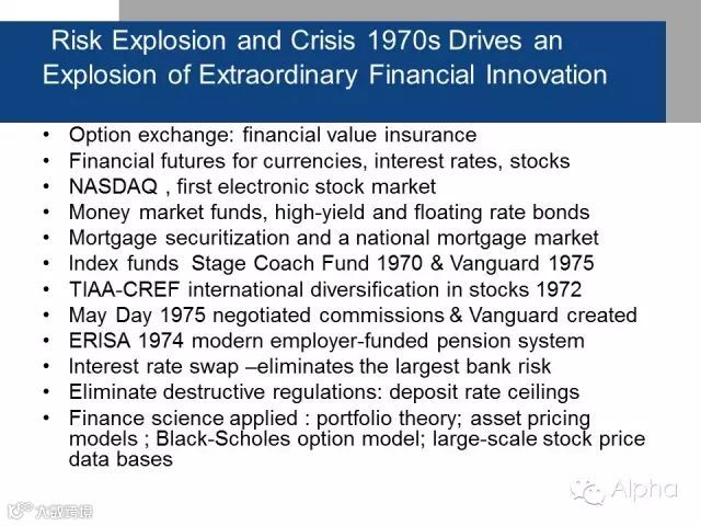 1970年代美国金融市场的发展,给我们带来什么启示?风险都非常大,一夜之间变得非常大,所有的风险都出现,新的金融产品创新也是同时出现,让经济、私营经济解决应对风险,更好地管控风险,能够以更快方式适应他们。所以创新的好处在于,对美国后续的35到40年大有裨益,因为它的好处非常明显。有时候大家想金融行业就是一个电脑数字和头脑之间的博弈,有人输有人赢,但其实不是这样。这些金融创新不仅仅只是一场游戏而已。
