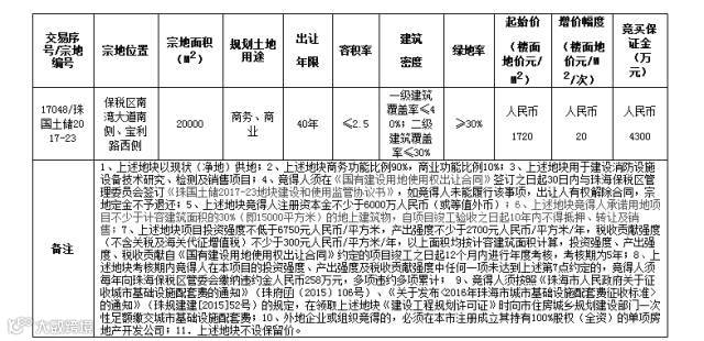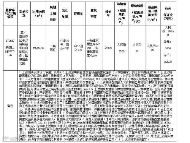 同日,另外一幅为珠国土储2017-26号地块也挂牌出让,地块规定住宅仅能销售给竞得人及其实际投资人在本地的关联企业员工或珠海高栏港经济区辖区范围内注册的工业企业员工,员工所取得住宅自核发《不动产权证》之日起10年后方可转让。