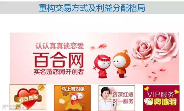 ②重构。例如百合网,通过改变原来婚姻中介行业的按次收费的方式为一次性的VIP服务。将原来一次200元的服务改为一次性收几千元,甚至上万元的打包解决方案。