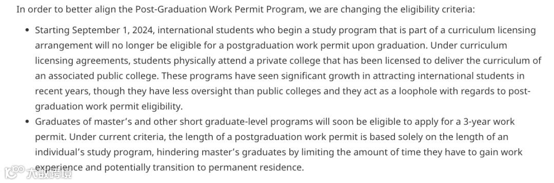 1、从2024年9月1日开始,开始参加课程许可安排的国际学生将不再有资格获得毕业后工签。根据课程许可协议,学生实际上参加被授权提供相关公立学院课程的私立学院。近年来,这些计划在吸引留学生方面取得了显著增长,尽管它们的监管不如公立学院严格,但它们成为毕业后工签申请资格的漏洞。