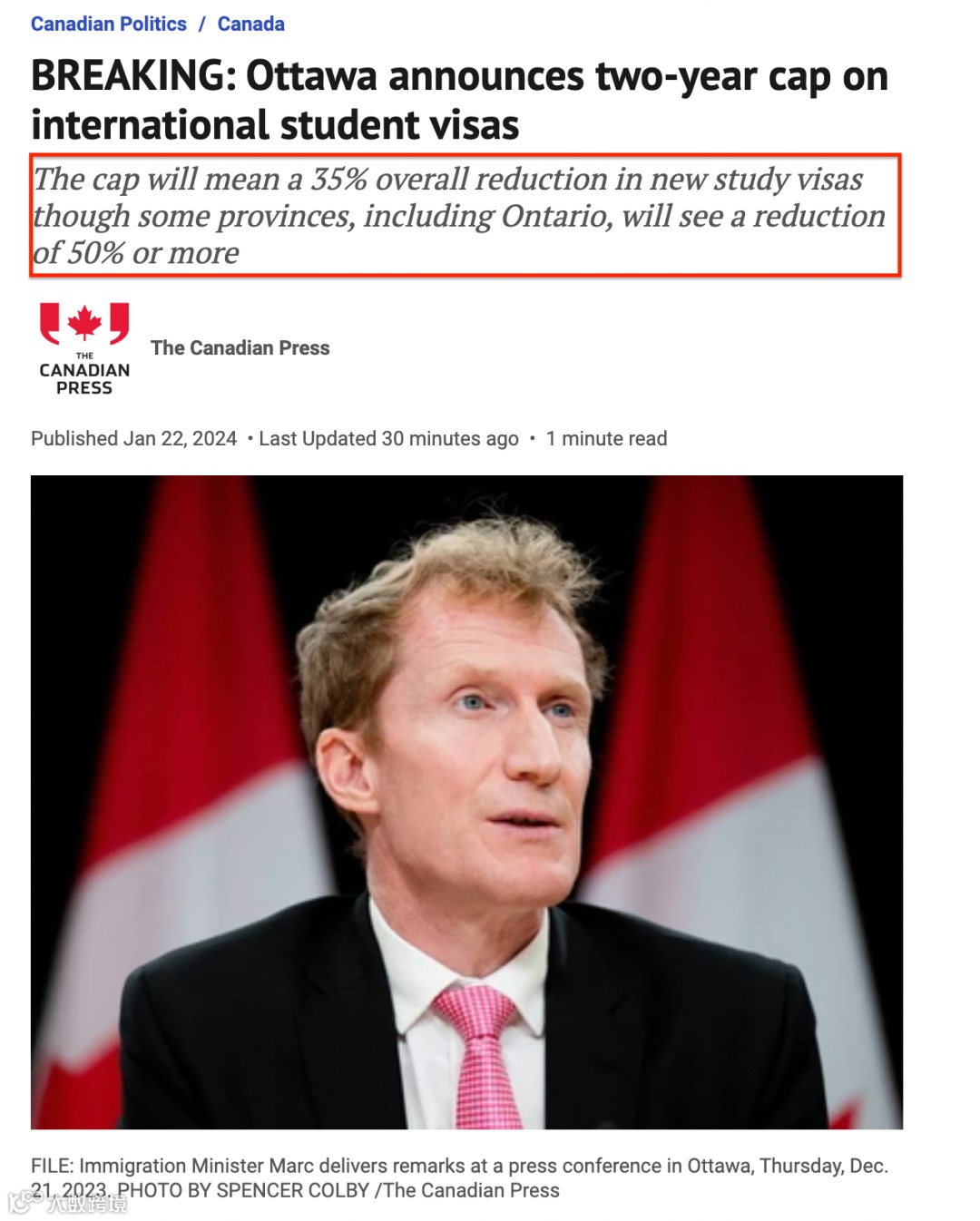 加拿大移民部长马克·米勒今天(1月22日)宣布学签限制措施!