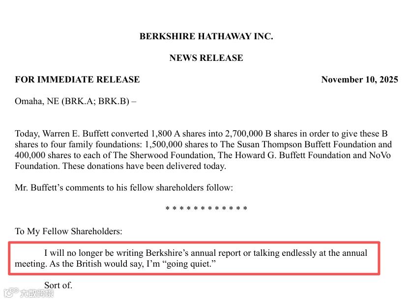 这位被称为“股神”的传奇投资者正式宣布,今年年底将不再撰写伯克希尔的年度报告,也不再在年会上无休止地讲话。Going quiet!