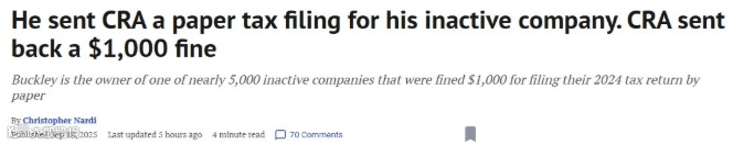 Buckley说:“只要你是公司并用纸质报税,自动就被罚款,CRA几乎不需要任何额外成本。”