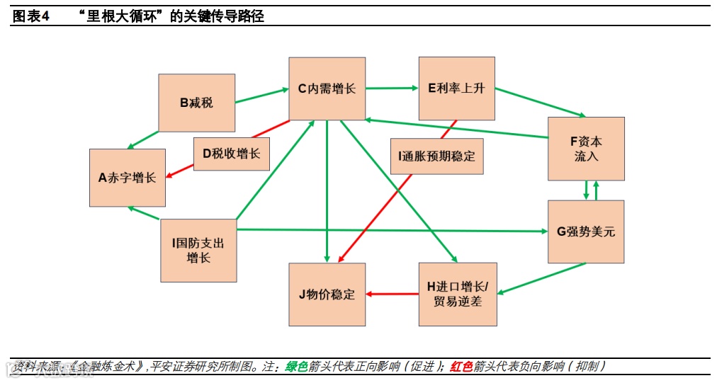 对于特朗普2.0,平安证券认为“特朗普大循环”可能更加不稳定,减税政策的收益可能更不明显,如果减税政策引发税收明显下降,自然增大赤字扩张压力,最终可能限制政府支出能力,削弱赤字扩张与经济增长之间的循环。