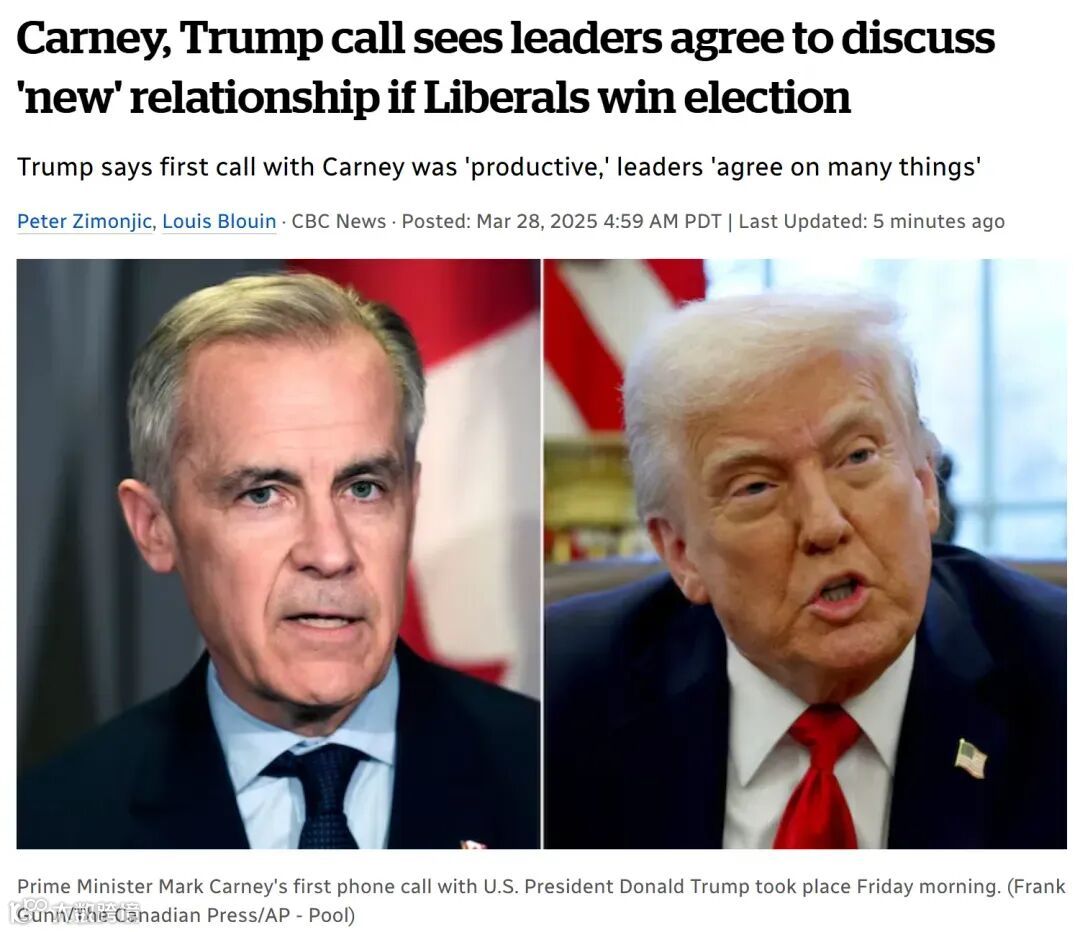 与此同时,今天早上加拿大总理卡尼(Mark Carney)与美国总统特朗普(Donald Trump)进行了首次正式通话。