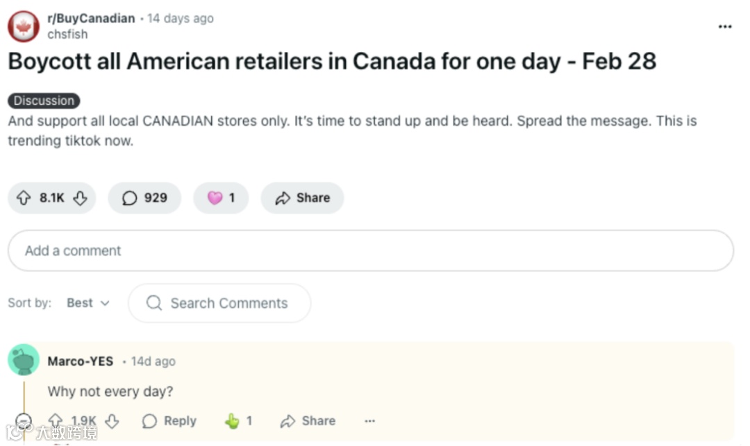 截至发稿前,已经有数千人评论支持。脸书上“购买加拿大国货”的小组成员已经接近100万,大家都在逐渐减少购买美国商品。