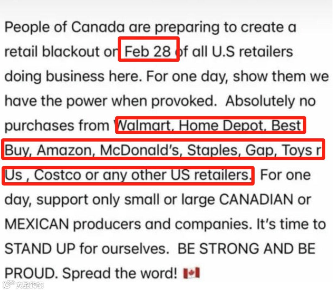 “2月28日,在加拿大抵制所有的美国零售店!只支持加拿大本土商店!是时候站起来并让大家听到我们的声音了!”