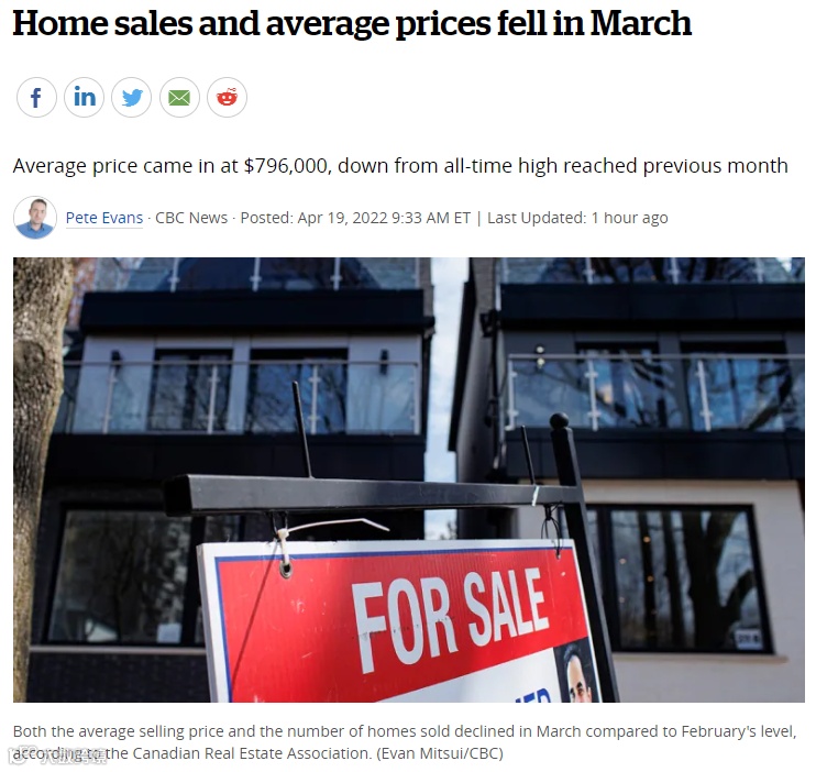 今天,加拿大地产协会(CREA)公布了全国3月的房屋数据,加拿大如今房屋的平均售价为79.6万加币,这比2月时的历史最高价下降了约3%。