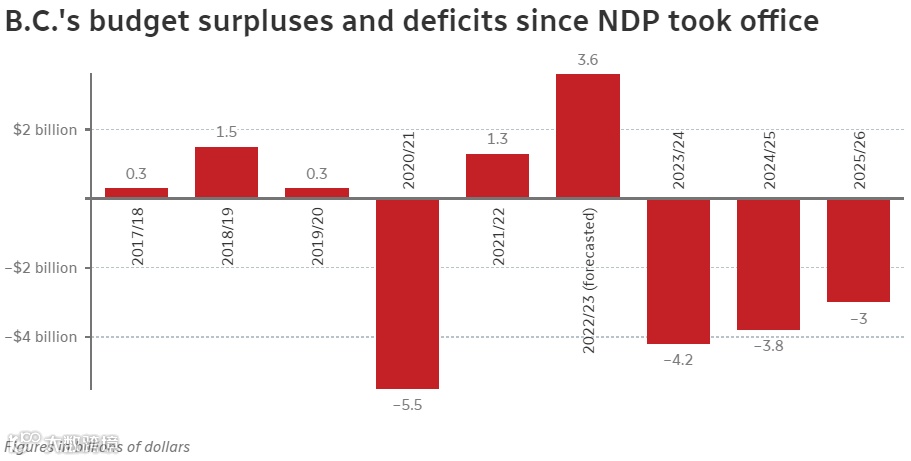据CTV、CBC、《温哥华太阳报》等多家媒体报道,BC省新民主党政府刚刚公布了2023财年的预算。省府正在度过预期的经济低迷期,预计2022年将有36亿加元的盈余,但2023财年要以42亿加元的赤字结束。